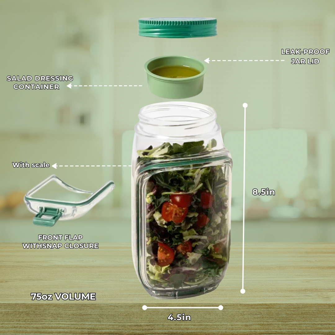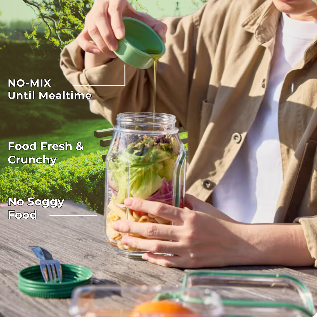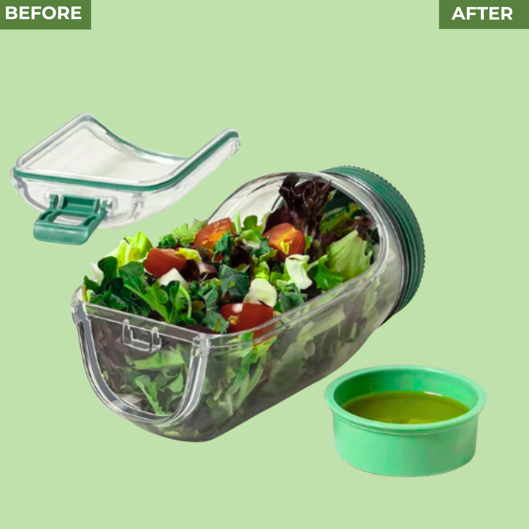 Ti prepari un'insalata fresca al mattino, ma a pranzo è inzuppata e triste. È disordinata, uno spreco e uccide la tua sana motivazione. FreshPort™ mantiene ogni strato croccante e fresco finché non lo mescoli. Realizzato da Tritan® senza BPA, non plastica economica come i normali barattoli o i Tupperware, è a tenuta stagna, durevole, sicuro per gli alimentie delle dimensioni perfette di 8,5" × 4,5".